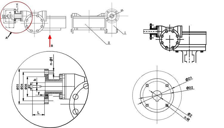 | Ду | D1 | D2 | D3 | D4 | D5 | f | Ø1 | Ø2 | n‐M | Фланец EN ISO | n‐Ø1 | b | L | Крутящий момент, выходной вал затвора (Нм) | Редуктор | Крутящий момент*, выходной вал редуктора (Нм) | |||||