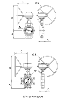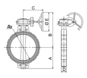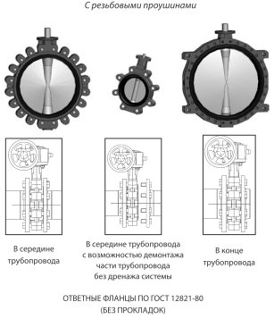 Поворотные дисковые затворы управляются с помощью редукторного механизма. Монтаж осуществляется посредством межфланцевых соединений, имеющих проушины с резьбой.