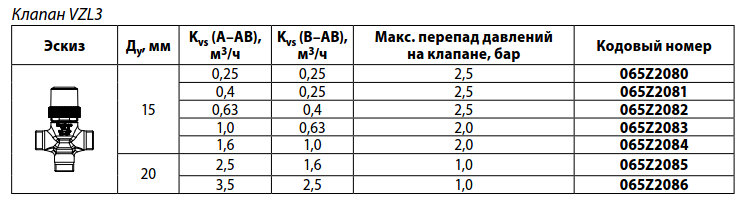 Клапаны регулирующие Danfoss VZL 3 имеют логарифмическую характеристику регулирования с пониженной пропускной способностью порта B. Суммарная пропускная способность составляет от 0,25 до 3,5 кубометров. Латунь и сталь, из которых изготавливаются регуляторы, рассчитаны на работу с водой или водно-гликолевым раствором (до 50%), разогретым до +120 °C.