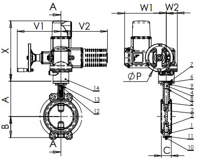 | Ду | Код затвора | Код электропривода | ØP | V1 | V2 | W1 | W2 | X | |